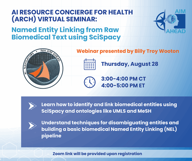 Register now to attend the virtual ARCH Workshop, "Named Entity Linking from Raw Biomedical Text using SciSpacy" on Thursday, August 28, 2025 at 3:00 p.m. Central Time. This webinar is hosted by Billy Troy Wooton.