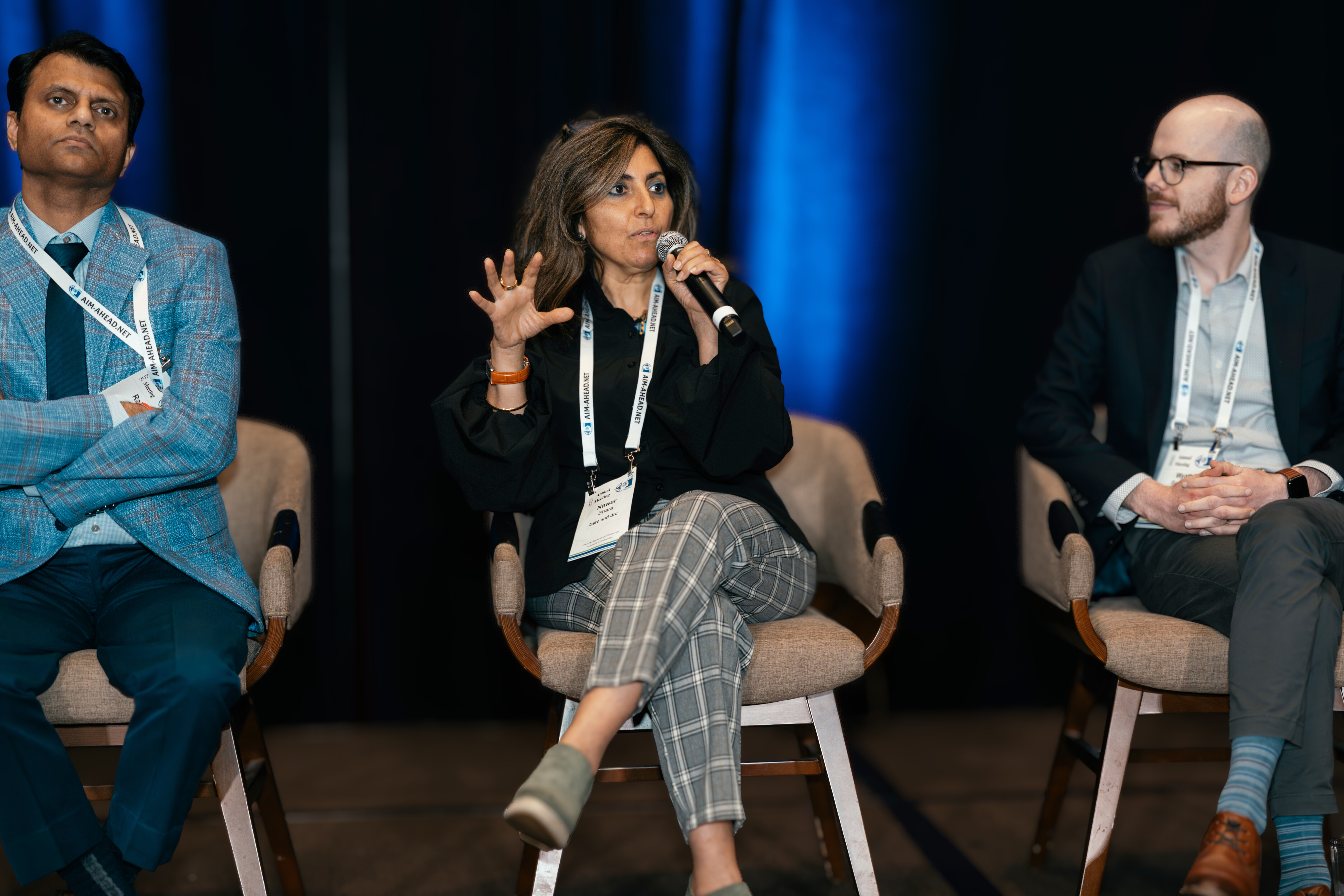 [Top Left] Dr. Nawar Shara (center) responds to audience questions during the “Empowering Progress: Data Requests Driving AIM-AHEAD Programs” panel discussion, joined by Dr. Rajbir Singh (left) and Dr. Wyatt Bensken (right).